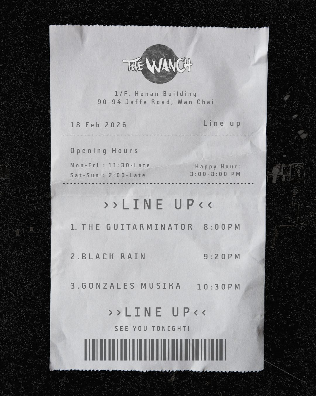 WEDNESDAY NIGHT at The Wanch! Tonight's lineup kicks off with The Guitarminator at 8:00 PM, followed by Black Rain at 9:20 PM, and Gonzales Musika closing the night at 10:30 PM. Happy Hour runs 3-8 PM—come early …