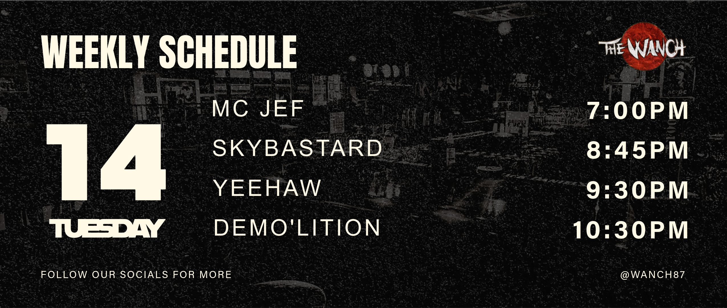 TUESDAY NIGHT at The Wanch! MCJef at 7:00 PM, Skybastard at 8:45 PM, Yeehaw at 9:30 PM, and Demo'lition closing at 10:30 PM. Grab your boots and come on down! Follow us @wanch87 for more updates. 星期二夜晚 …