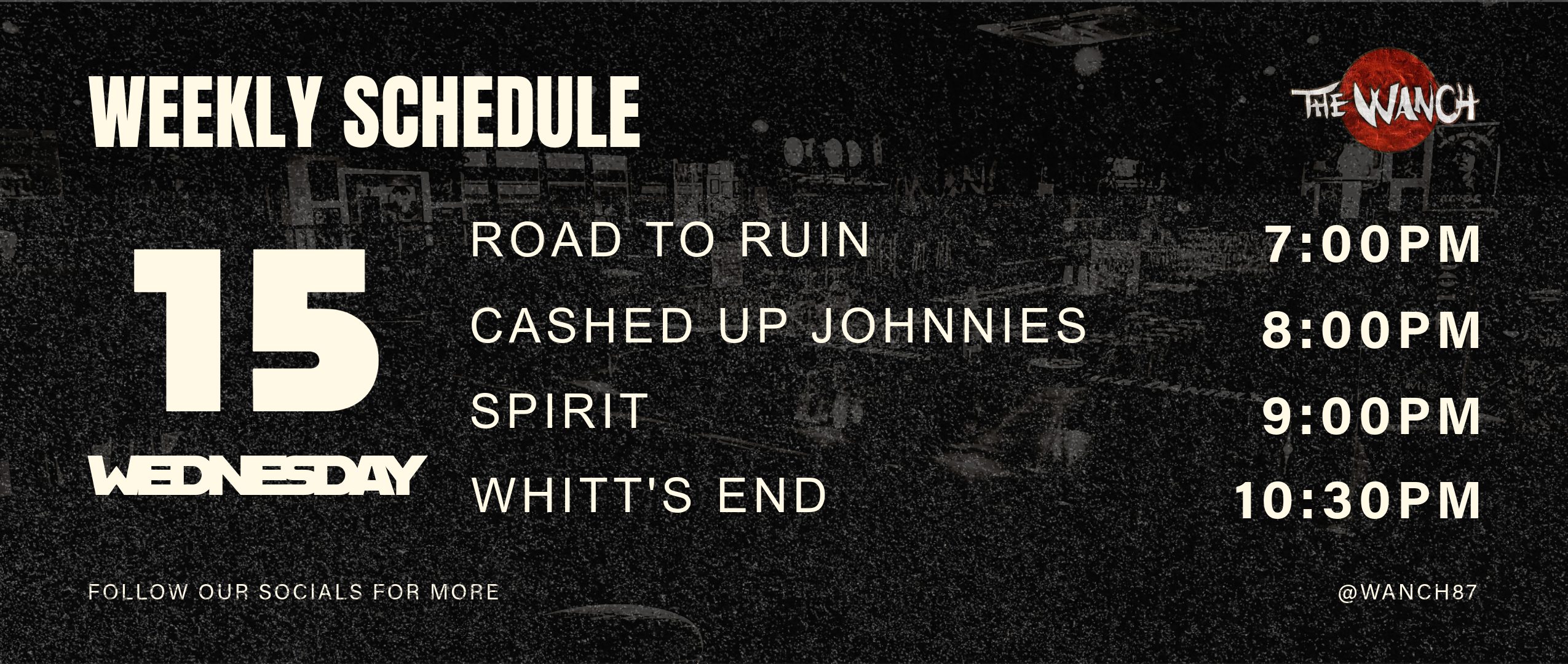 WEDNESDAY NIGHT at The Wanch! Punk rock energy all night: Road to Ruin at 7:00 PM, Cashed Up Johnnies at 8:00 PM, Spirit at 9:00 PM, and Whitt's End closing at 10:30 PM. For fans of Green Day …