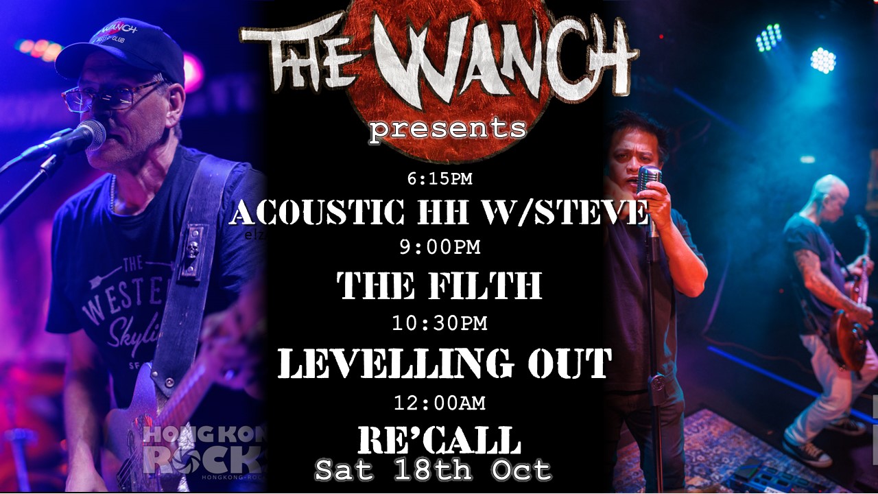 The Wanch rocks your Saturday at 6:15pm with Acoustic Happy Hour featuring Steve performing acoustic rock & originals. 9pm Police Tribute Band The Filth performs your favorites from The Police. 10:30pm Levelling Out perform rock & blues rock favorites from the 70’s & 80’s. 12am RE’CALL rocks till the early hours performing favorites from Soundgarden, Pearl Jam, Nirvana, ACDC, Limp Biskit, & Originals. Happy Hour is from 2-8pm & our kitchen staff is serving our ala carte menu from 2:30pm till 10:40pm. No Cover Charge. We thank you for your continued support of The Wanch & The HK Live Music Scene.
