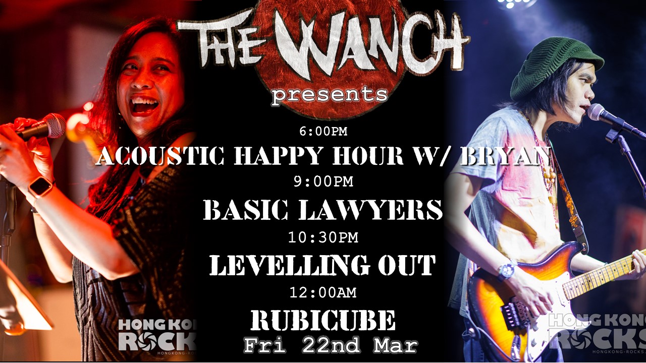 The Wanch kicks off your Friday night at 6pm with Acoustic Happy Hour featuring Bryan performing acoustic rock favorites. 9pm Basic Lawyers perform classic rock favorites. 10:30pm Levelling Out performs 70’s & 80’s rock & blues rock favorites. 12am Rubicube performs rock favorites from The Foo Fighters, Jimi Hendrix, The Stones, Green Day, The Police & Originals. Happy Hour is from 3pm till 8pm & our kitchen staff is serving our ala carte menu from 3pm till 10:40pm. We thank you for your continued support of The Wanch & The HK Music Scene.