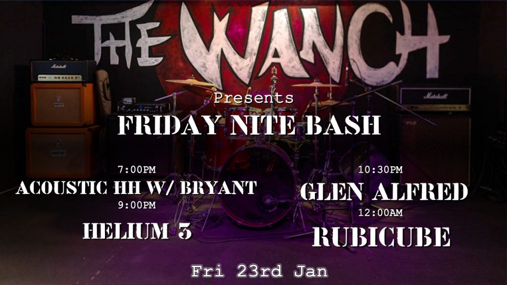 7pm Acoustic Happy Hour Featuring Bryant 9pm Helium 3 10:30pm Glen Alfred 12am Rubicube