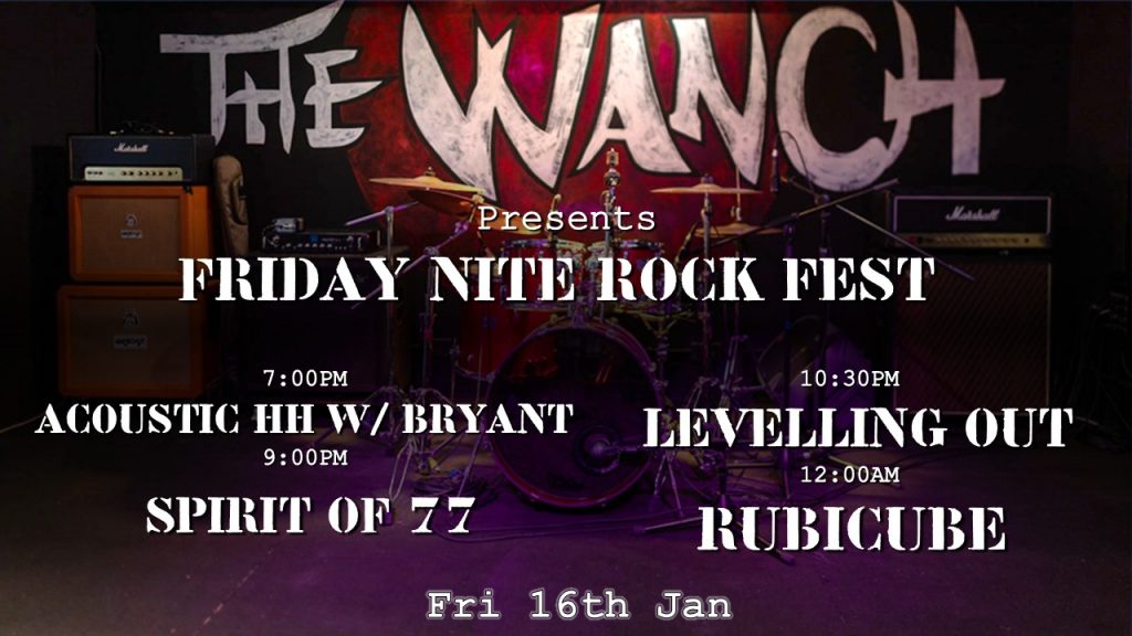 7pm Acoustic Happy Hour Featuring Bryant 9pm Spirit Of 77 10:30pm Levelling Out 12am Rubicube
