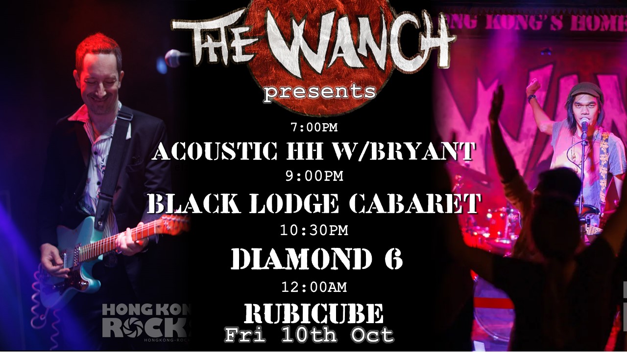 The Wanch kicks off the weekend at 7pm with Acoustic Happy Hour featuring Bryant performing acoustic rock & originals. 9pm Black Lodge Cabaret performs rockabilly, surf music, 50’s 60’s classic rock & show tunes. 10:30pm Diamond 6 performs 80’s rock favorites & originals. 12am Rubicube performs favorites from Jimi Hendrix, Pearl Jam, Aerosmith, Green Day, The Beatles, Doors, & originals. Happy Hour is from 3pm till 8pm & our kitchen staff is serving our ala carte menu from 3pm till 10:40pm. No Cover Charge. We thank you for your continued support of The Wanch & HK’s Live Music Scene
