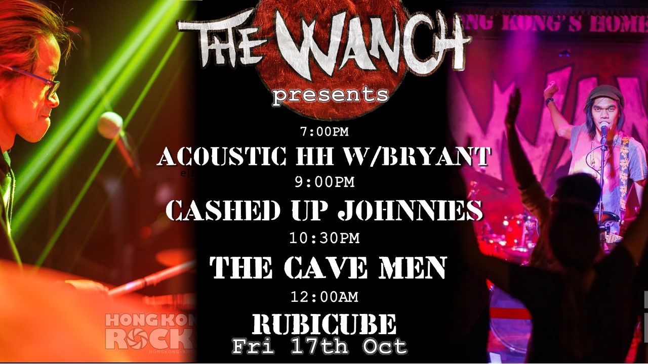 The Wanch kicks off your Friday night at 7pm with Acoustic Happy Hour featuring Bryant performing acoustic rock & originals. 9pm Cashed Up Johnnies get the party rolling with classic rock from the 40’s & 50’s along with favorites by Johnny Cash. 10:30pm The Cave Men return performing favorites from the 60’s & 70’s everything from The Doors to Deep Purple. 12am Rubicube perform favorites from Jimi Hendrix, Aerosmith, Green Day, The Foo Fighters, Pearl Jam, and Originals. Happy Hour is from 3pm till 8pm & our kitchen staff is serving our ala carte menu from 3pm till 10:40pm. No Cover Charge. We thank you for your continued support of The Wanch & The HK Live Music Scene.