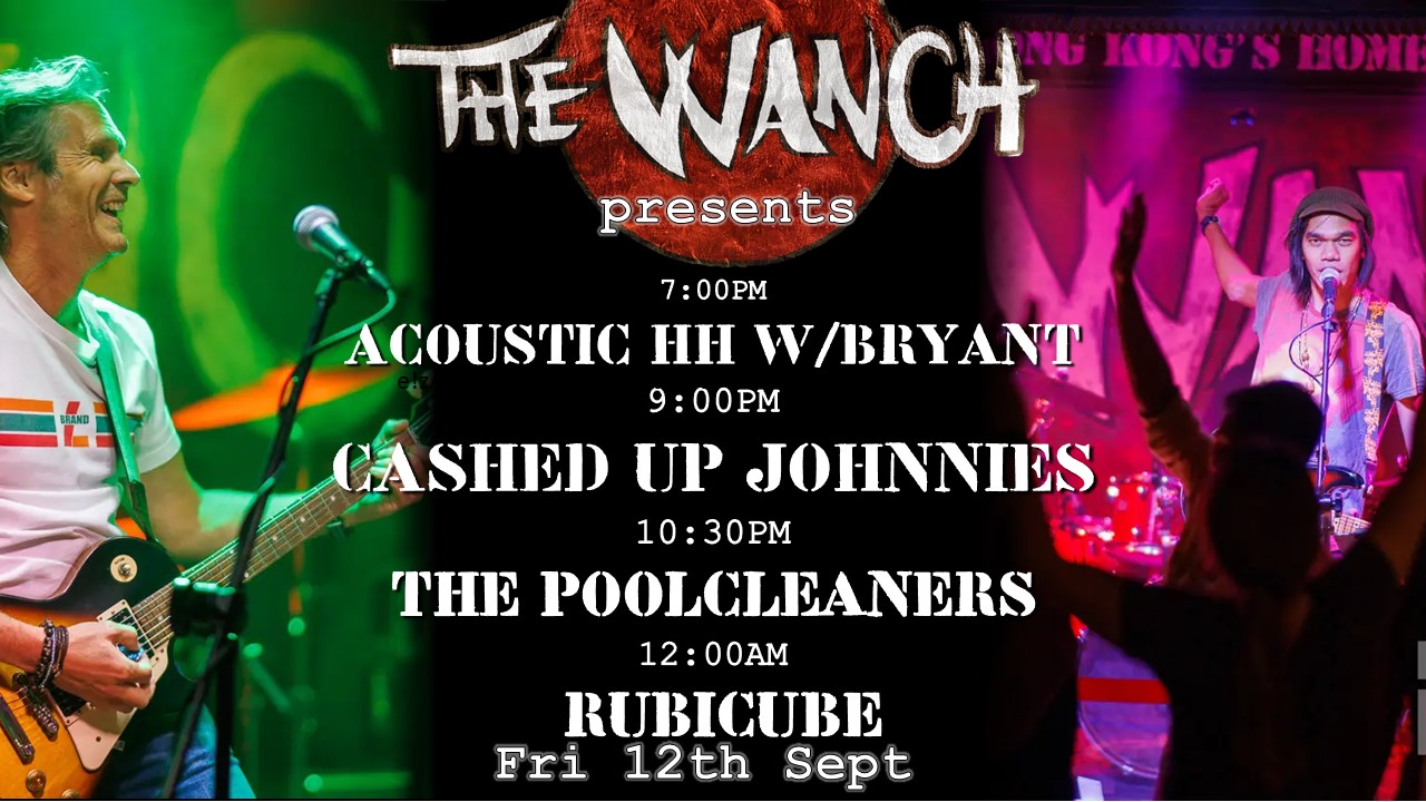 The Wanch kicks off your weekend with a rocking Friday Night. Starting at 7pm with Acoustic Happy Hour featuring Bryant performing acoustic rock & originals. 9pm Cashed Up Johnnies perform rock from the 40’s-60’s and favorites from Johnny Cash. 10:30pm The Poolcleaners perform 70’s-90’s rock & originals. 12am Rubicube performs favorites from The Foo Fighters, Aerosmith, Jimi Hendrix, The Doors, Green Day, ACDC, Originals, and other Rock Favorites. Happy Hour is from 3pm till 8pm & our kitchen staff is serving our ala carte menu from 3pm till 10:40pm. No Cover Charge from HK’s Unofficial Home Of Live Music. The Wanch