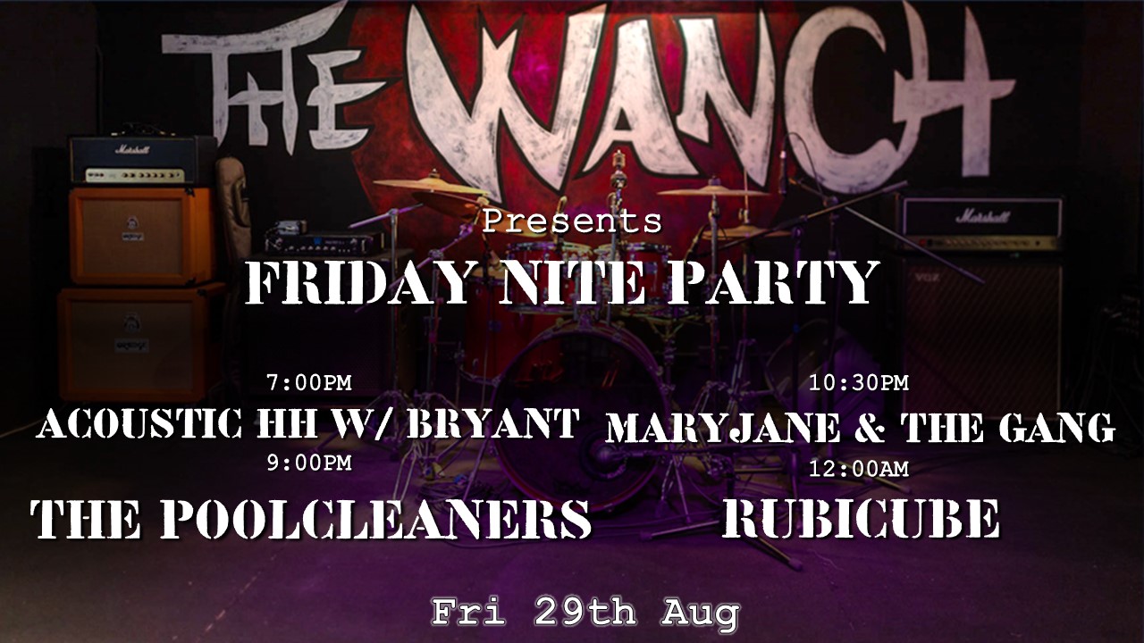 The Wanch kicks off your Friday Night at 7pm with Acoustic Happy Hour featuring Bryant performing acoustic rock & originals. 9pm The Poolcleaners perform 80’s, 90’s and Australian Rock. 10:30pm Maryjane & The Gang perform favorites from The B-52’s, Blondie, The Police, The Cure, Originals, and other rock favorites. 12am Rubicube keeps the night rocking with favorites from Aerosmith, Jimi Hendrix, The Beatles, The Foo Fighters, Green Day, Originals, and other rock favorites. Happy Hour is from 3pm till 8pm & our kitchen staff is serving our ala carte menu from 3pm till 10L40pm & No Cover Charge, All this from The Wanch “Where Music Means Something.: