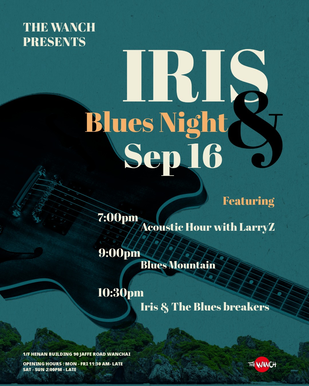7pm Acoustic Happy Hour features LarryZ performing acoustic rock favorites, 9pm Its Iris Blues Night with Special Guest Blues Mountain as they perform blues & blues rock standards. 10:30pm Iris & The Bluesbreakers perform blues favorites from BB King to Eric Clapton to Muddy Waters. Happy Hour is from 3pm till 8pm & our kitchen staff is serving our ala carte menu from 3pm till 9:40pm. No Cover Charge. We thank you for supporting The Wanch & The HK Live Music Scene.