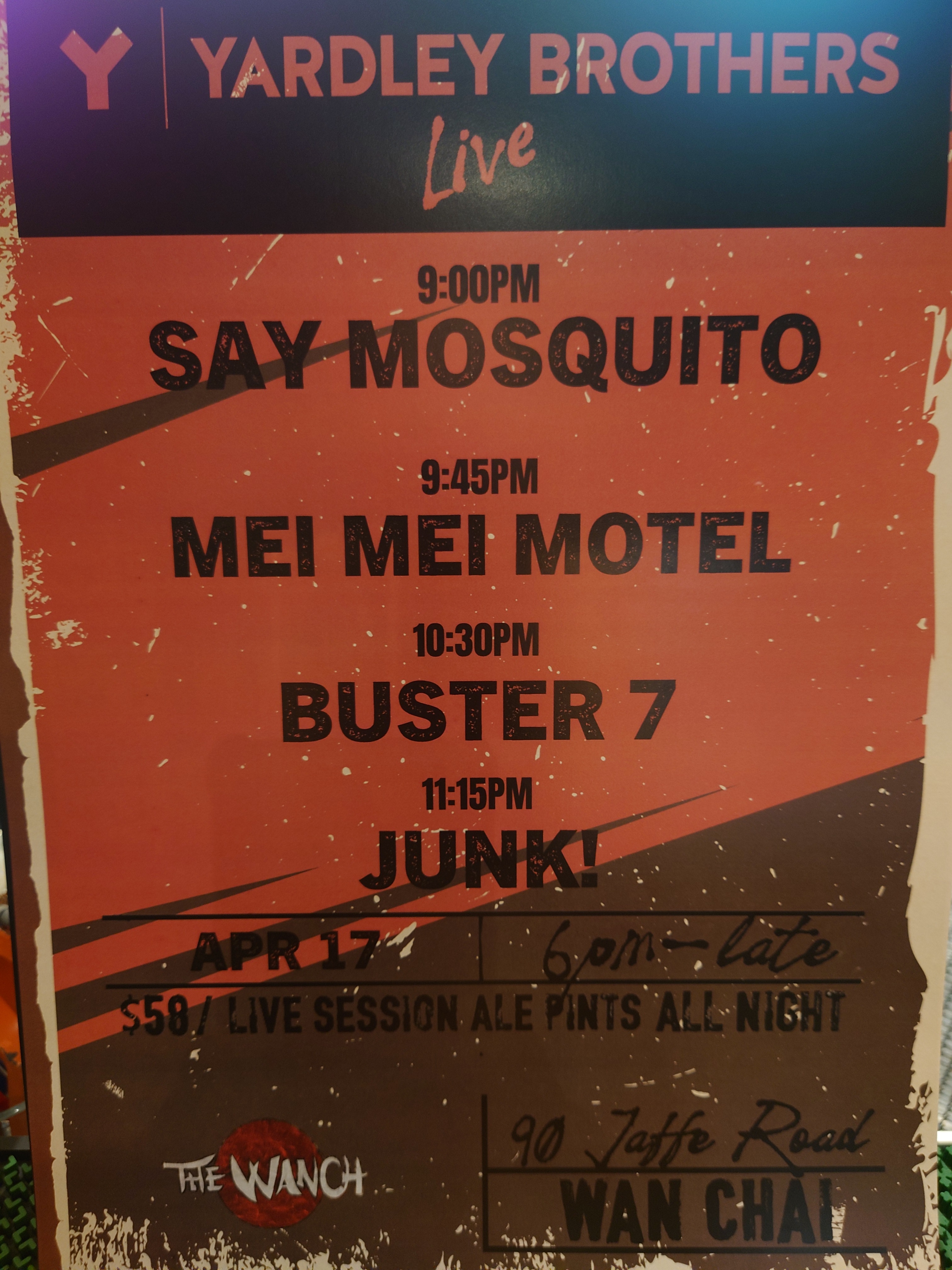 The music starts at 7pm with Acoustic Happy Hour featuring LarryZ performing acoustic rock favorites. 9pm Yardley Brothers Live features original music performed by Say Mosquito, 9:45pm Mei Mei Motel, 10:30pm Buster 7, 11pm JUNK. Happy Hour is from 3pm till 8pm & our kitchen is open from 3pm till 9:40pm. Enjoy Yardley Brothers Live Session Ale all night long at $58/pint. No Cover Charge. We thank you for supporting The Wanch & The HK Live Music Scene.