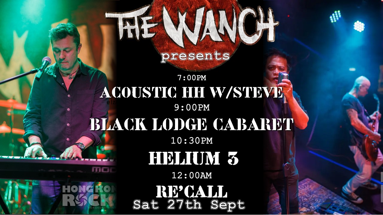 Doors open at 8:30pm. 9pm Black Lodge Cabaret returns performing Classic Rock, Surf Rock, Rockabilly, & Show Tunes. 10:30pm Helium 3 performs rock favorites from the 70’s thru 00’s and Originals. 12am RE’CALL rocks till the early hours with favorites from Pearl Jam, Soundgarden, Limp Biskit, System Of The Down, Iron Maiden, Originals & other rock favorites. Happy Hour is from 2pm till 8pm & our kitchen staff is serving our ala carte menu from 2:30pm till 10:40pm. No Cover Charge. We thank you for your continued support of The Wanch & The HK Live Music Scene