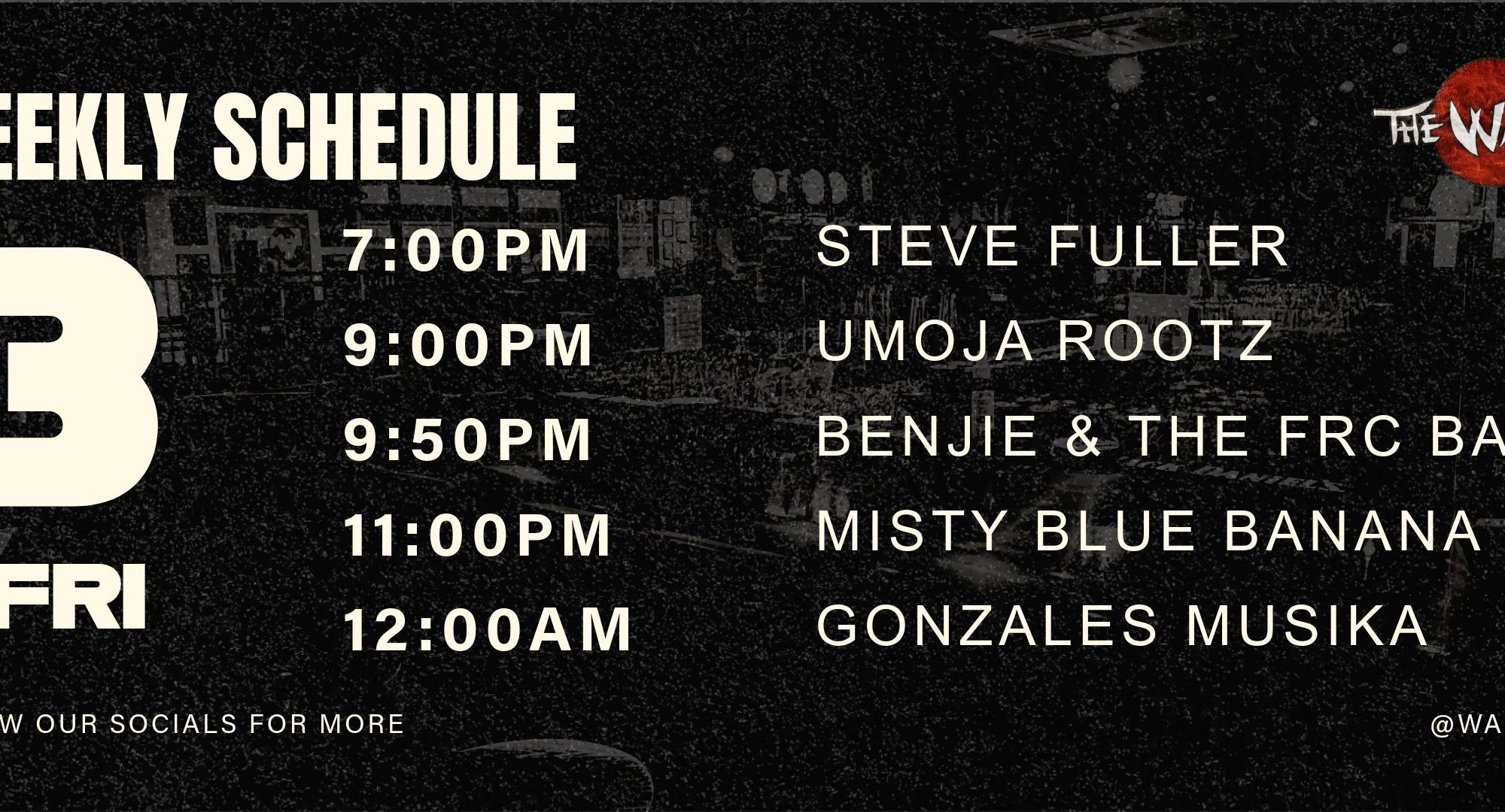 Tonight’s massive lineup: Steve Fuller at 7:00 PM, Umojarootz at 9:00 PM, Benjie & The FRC Band at 9:50 PM, Misty Blue Banana at 11:00 PM, and Gonzales Musika closing at midnight. Five bands, one epic Friday—see you on the dance floor!