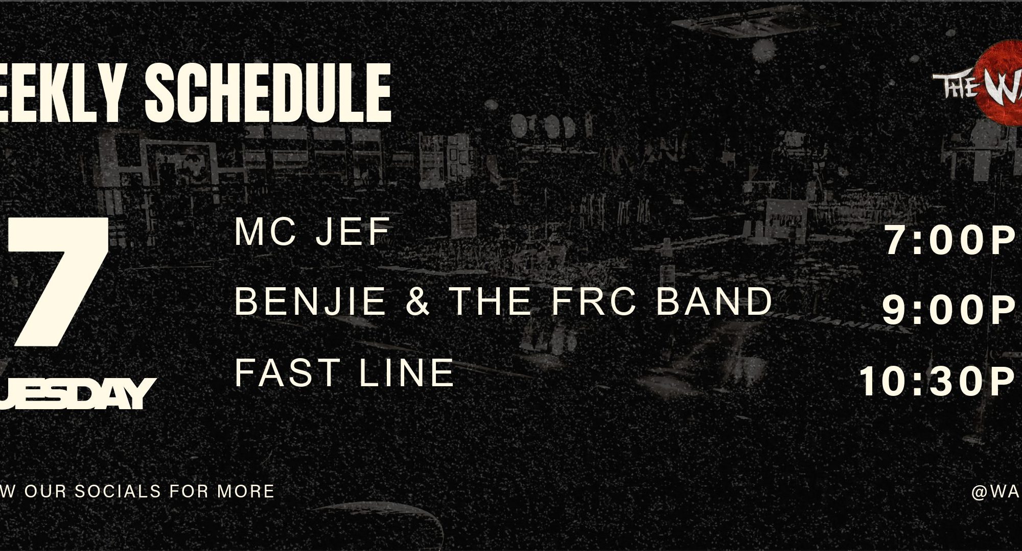 Tonight’s lineup: MCJef at 7:00 PM, Benjie & The FRC Band at 9:00 PM, and Fast Line closing at 10:30 PM.