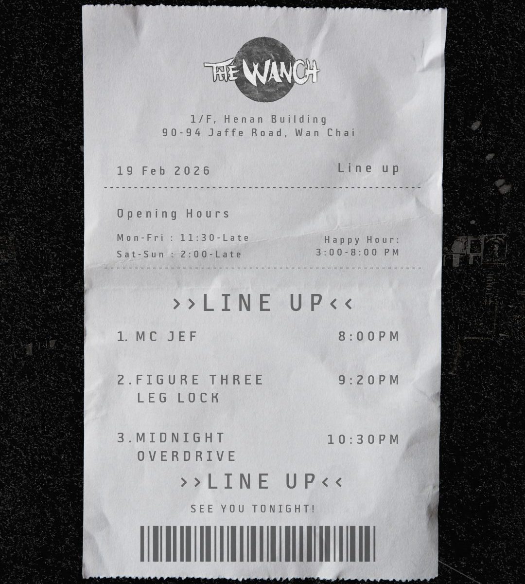 星期四狂熱夜 Wanch 爆發! 今晚陣容夠晒勁:8:00 MC Jef 開場,9:20 Figure Three Leg Lock 接力,10:30 Midnight Overdrive 壓軸炸場。