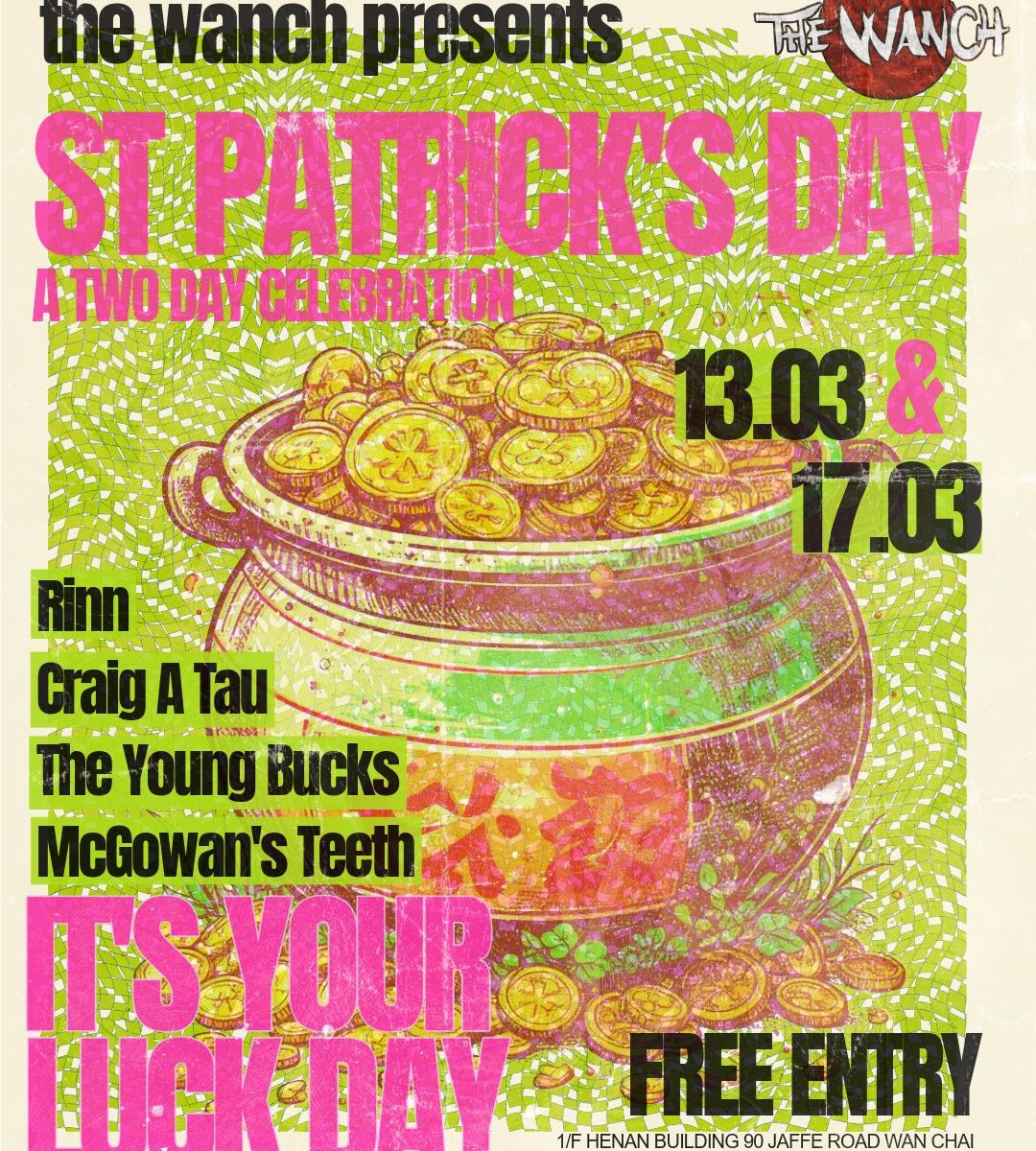 提早開波慶祝!今晚陣容:晚上7:30 Rinn 開場,9:00 Craic A Tau 接力,10:55 The Young Bucks,午夜壓軸 Rubicube 炸場到尾。愛爾蘭氣氛、凍啤酒、搖滾樂——齊齊狂歡!