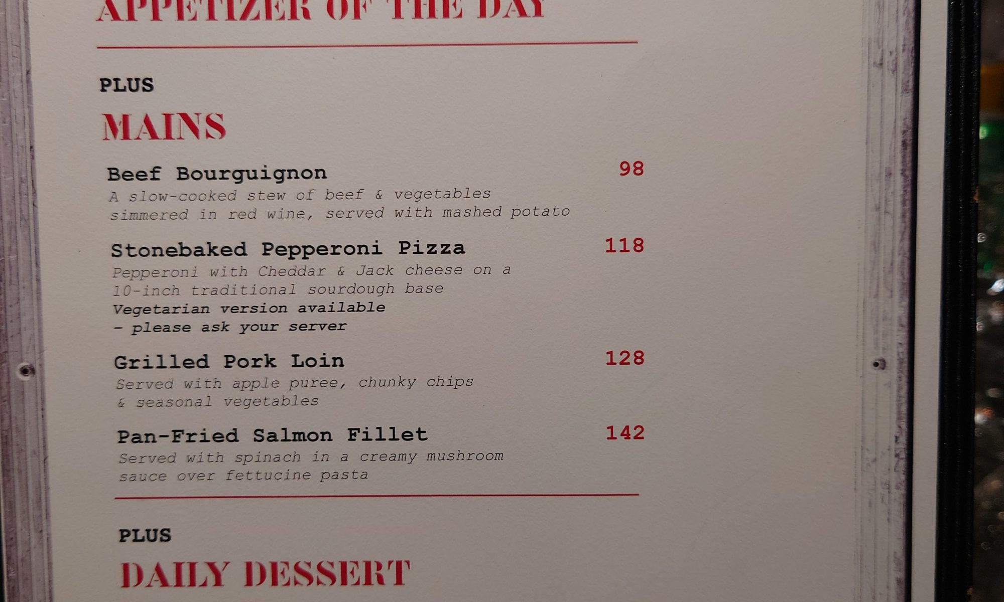 Looking for a hot homemade lunch in a relaxing atmosphere The Wanch is the place. Begin your meal with a homemade soup or salad. The you have your choice from four homemade mains: Beef Bourguignon, Stone-Baked Pepperoni Pizza (Vegetarian Option Available), Grilled Pork Loin, or Pan-Fried Salmon Fillet. Then finish your meal with a homemade desert and iced lemon tea. Busy in the office then call 3692-5933 and we will prepare your lunch for take-away and give you a 10% discount. We thank you for supporting The Wanch and we look forward to serving you this week.