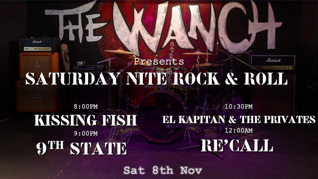 7pm Acoustic Happy Hour Featuring Steve 8pm Kissing Fish 9pm 9th State 10:30pm El Kapitan & The Privates 12am RE’CALL