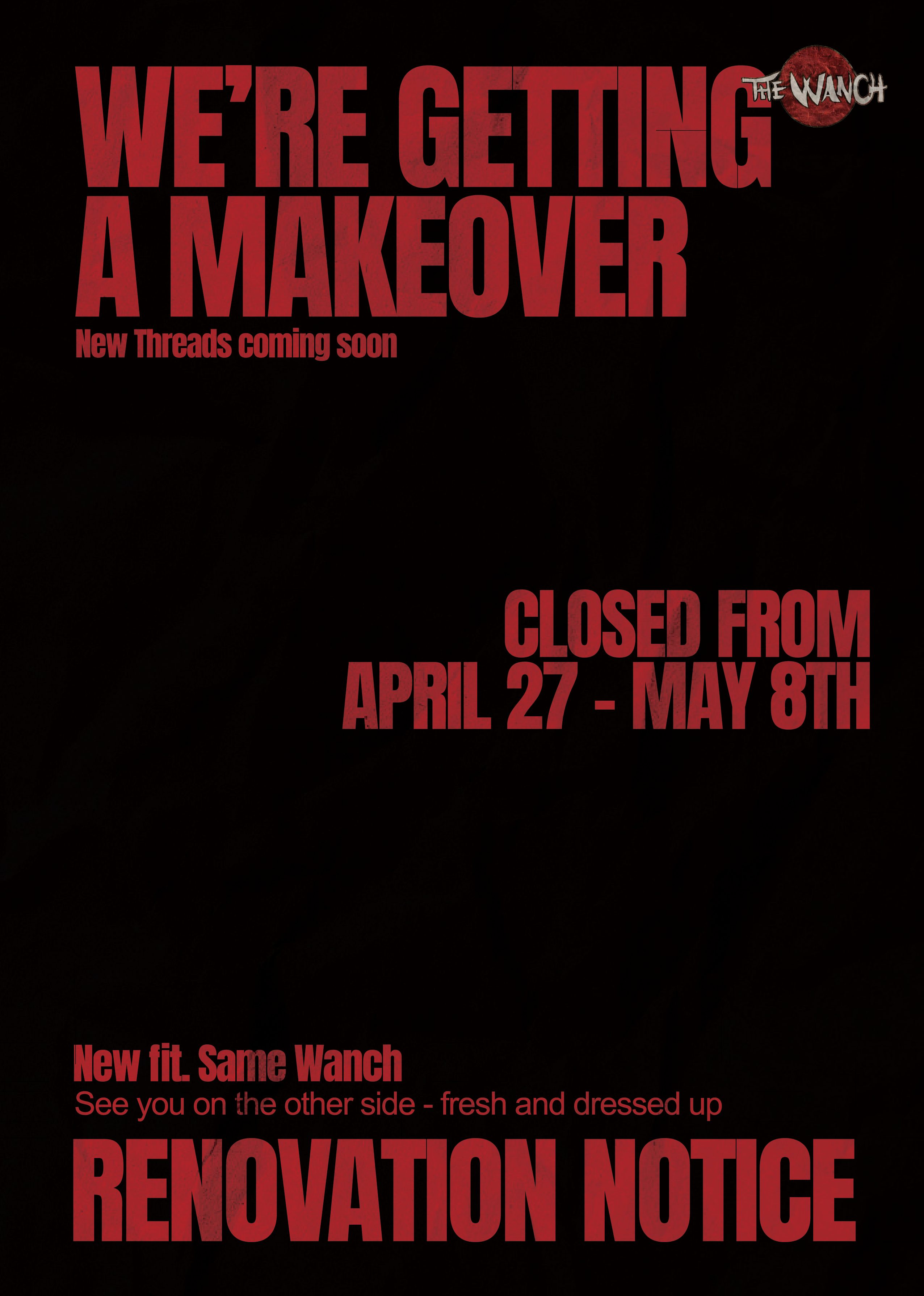 RENOVATION NOTICEWe're changing our clothes. Closed: April 27 – May 8Reopens: May 9 New fit. Same Wanch.