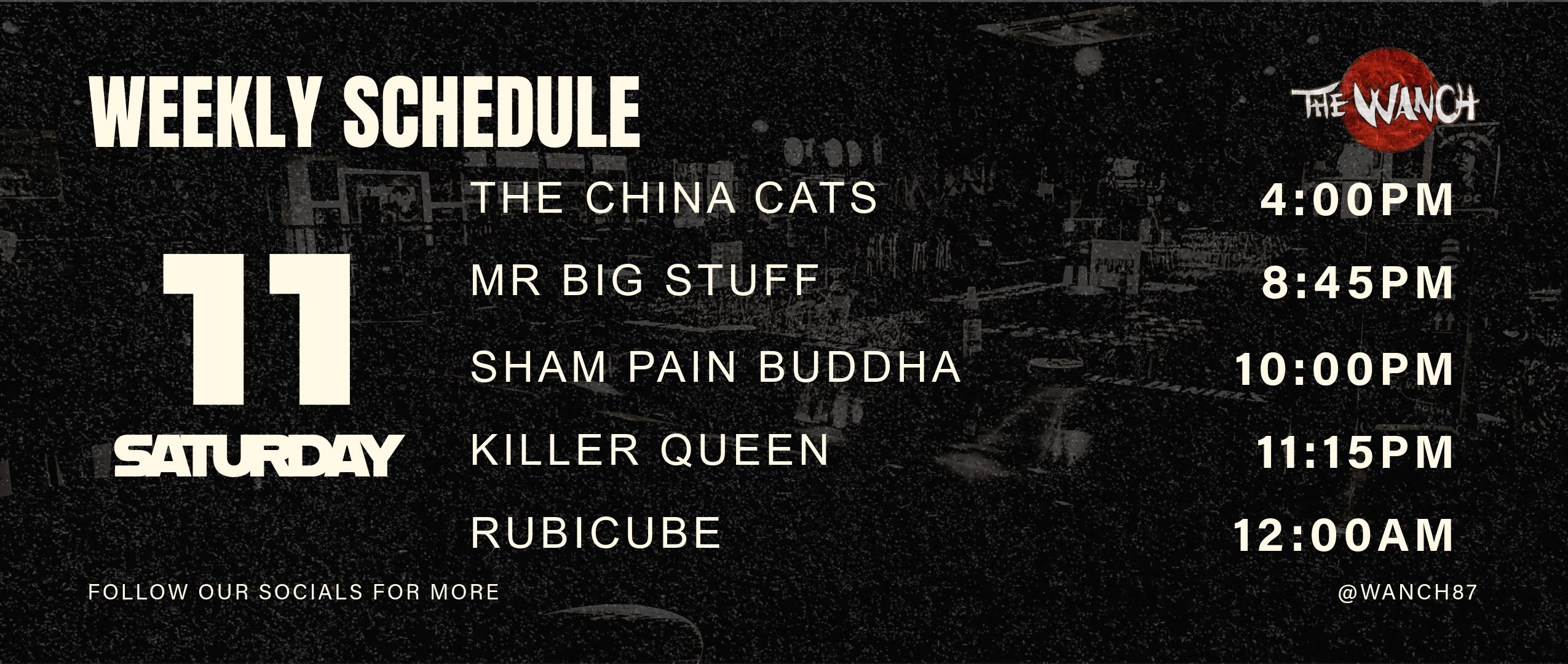 SATURDAY NIGHT SPECTACULAR at The Wanch! An epic afternoon-to-late lineup: The China Cats at 4:00 PM, Mr Big Stuff at 8:45 PM, Sham Pain Buddha at 10:00 PM, Killer Queen at 11:15 PM, and Rubicube closing at midnight. Five acts, …