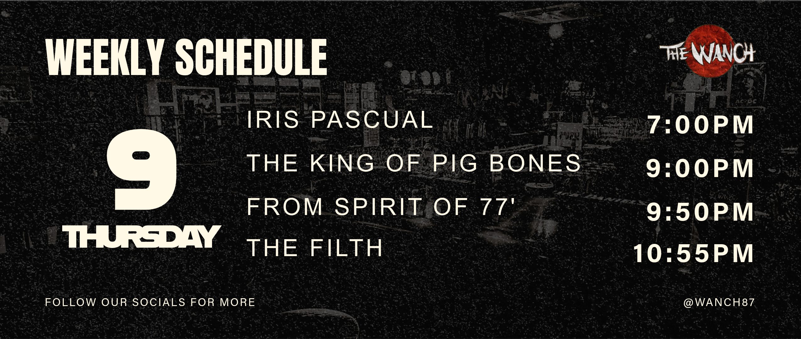 THURSDAY NIGHT at The Wanch! Tonight's lineup: Iris Pascual at 7:00 PM, The King of Pig Bones at 9:00 PM, From Spirit of 77' at 9:50 PM and The Filth closing at 10:55 PM. A night …