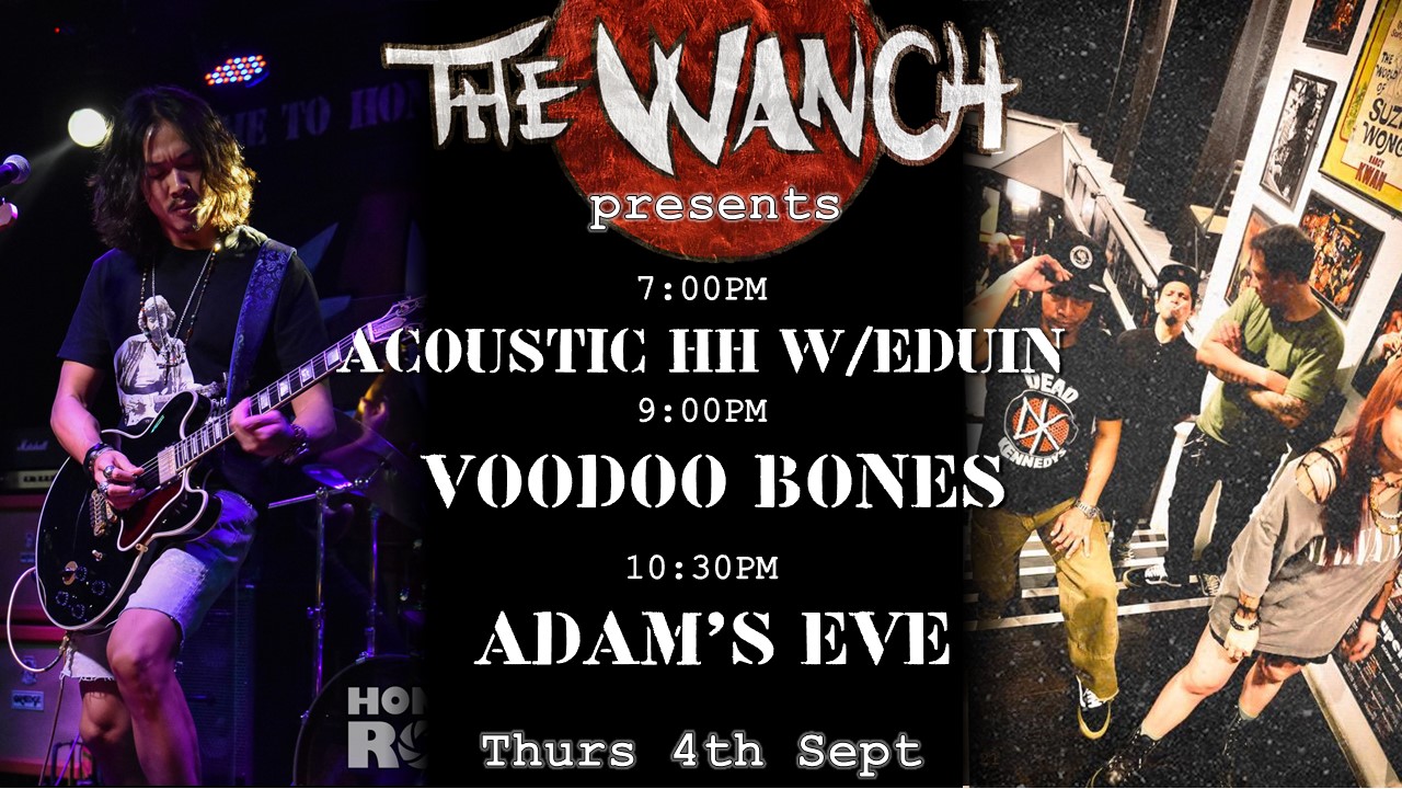 The Wanch rocks your Thursday starting at 7pm with Acoustic Happy Hour Featuring Eduin performing acoustic rock favorites. 9pm Voodoo Bones performs Blues & Blues Rock favorites. 10:30pm Adam’s Eve performs rock favorites from the 70’s-00’s. Happy Hour is from 3pm till 8pm & our kitchen staff is serving our ala carte menu from 3pm till 9:40pm. No Cocer Charge. From HK’s Unofficial Home Of Live Music… The Wanch
