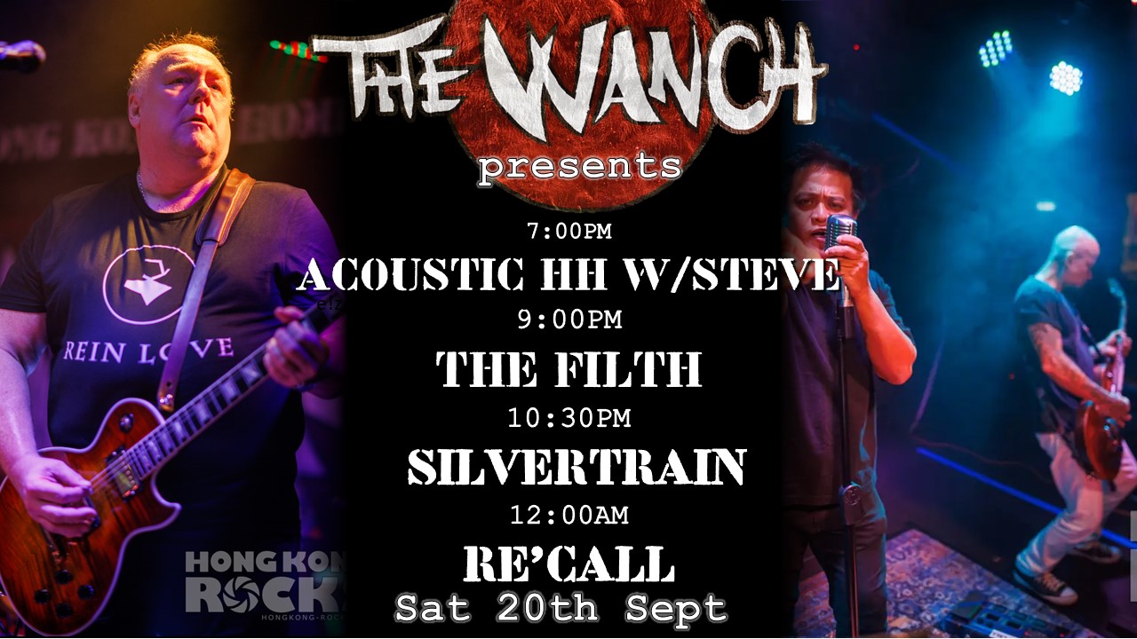 After the Record Fair at 7pm its Acoustic Happy Hour Featuring Steve performing acoustic rock & originals. 9pm The Police Tribute Band The Filth perform hits from The Police. 10:30pm Silvertrain performs rock favorites from the 70’s to the 90’s. 12am RE’CALL performs favorites from Soundgarden, Limp Biskit, Pearl Jam, The Foo Fighters, System Of The Down, Originals, and other rock favorites. Happy Hour is from 1pm till 8pm & our kitchen staff is serving our ala carte menu from 2pm till 10:40pm. No Cover Charge. We thank you for supporting The Wanch & HK’s Live Music Scene.